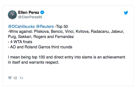 « Top 50 des victoires contre : Pliskova, Bencic, Vinci, Kvitova, Radacanu, Jabeur, Puig, Sakkari, Rogers et Fernandez, quatre finales WTA, les troisièmes tours de l’AO et de Roland Garros. Je veux dire qu’être dans le top 100 et entrer directement dans les tournois du Grand Chelem est un accomplissement en soi et mérite le respect »