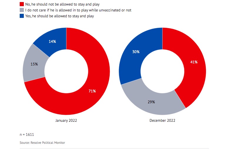 Le média WTAtoday a engagé un cabinet d’enquête pour essayer d’évaluer la cote de popularité de Novak Djokovic. Si en janvier 2022 en pleine crise, 71% des personnes interrogées ne voulaient pas qu’il soit autorisé à rester sur le territoire et jouer, ce pourcentage a nettement baissé passant à 41% (voir graphique ci‐dessous)