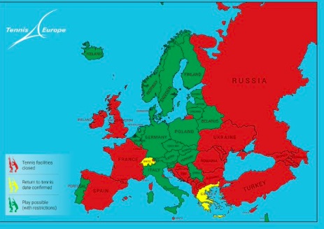 Très utile cette carte proposée régulièrement par le journaliste portugais José Morgado pour nous faire le point sur le déconfinement. Alors que le guide de la FFT sera dévoilé ce jour, il y a déjà une grande partie de l’Europe qui peut rejouer au tennis dans des conditions bien spécifiques de sécurité sanitaire.