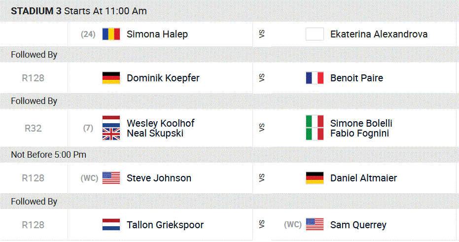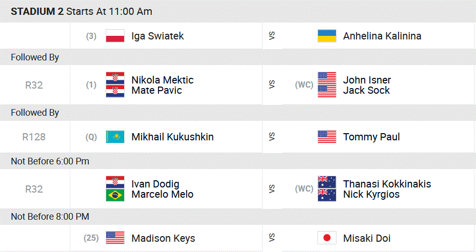 Tous les matchs sur tous les courts débutent à 20h, heure française.