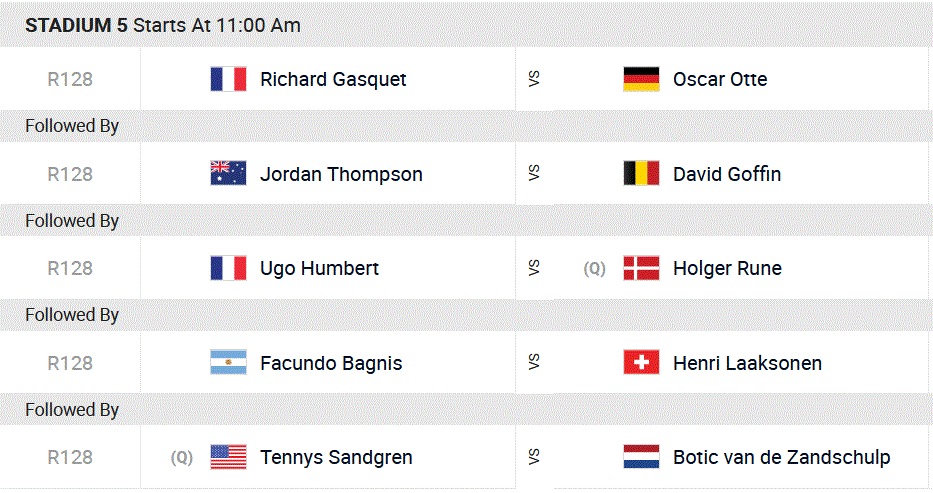 Côté Tricolores, on surveillera de près les entrées en lice de Richard Gasquet face à Oscar Otte, d’Ugo Humbert face à Holger Rune, de Benoît Paire face à Diminik Koepfer et d’Adrian Mannarino face au local Brandon Nakashima.