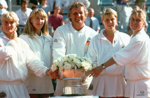 1992, l’équipe allemande pose avec le trophée de la Fed Cup