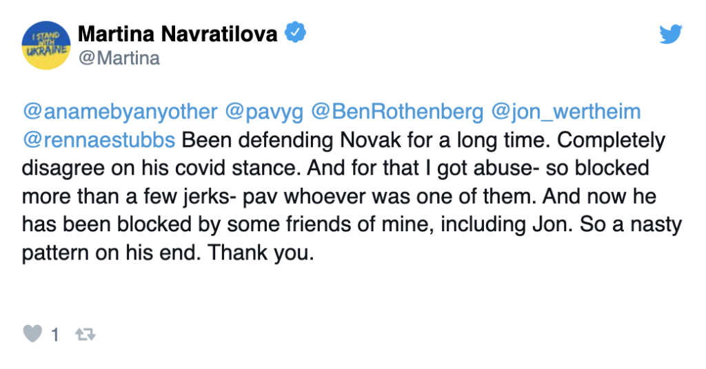 Notamment bloquée à cause de son désaccord avec Novak Djokovic sur sa position à propos du vaccin contre le Covid, Martina s’est donc expliquée sur l’oiseau bleu. « Je défends Novak depuis longtemps. Je ne suis pas du tout d’accord avec sa position sur la Covid. Et pour cela, j’ai été maltraitée – j’ai donc bloqué plus d’un abruti – « pavyg » était l’un d’entre eux. Et maintenant, il a été bloqué par certains de mes amis, dont Jon (Wertheim, ndlr). C’est donc une mauvaise habitude de sa part. Merci. »