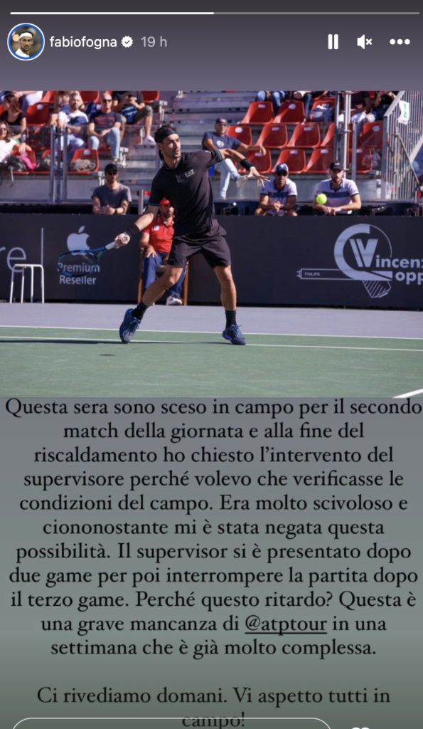 « Ce (jeudi) soir, je suis entré sur le terrain pour le deuxième match de la journée et à la fin de l’échauffement, j’ai demandé au superviseur d’intervenir car je voulais qu’il vérifie l’état du terrain. C’était très glissant et j’ai néanmoins été privé de cette opportunité. Le superviseur s’est présenté après deux jeux et a arrêté le match après le troisième. Pourquoi ce retard ? C’est un manque grave de la part de l’ATP dans une semaine qui est déjà très complexe », a écrit le joueur italien qui s’est lourdement incliné, 1–6, 1–6.