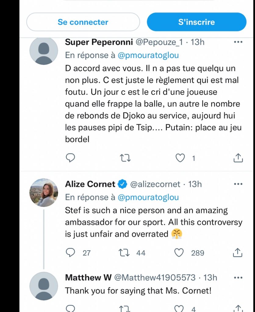 Après Nicolas Mahut dans les colonnes de L’Équipe alors qu’auparavant il avait été un peu plus précis chez nous, c’est au tour de la Niçoise de préciser les choses : « Stefanos est une belle personne et un formidable ambassadeur de notre sport. Cette polémique n’est pas juste et surfaite. »