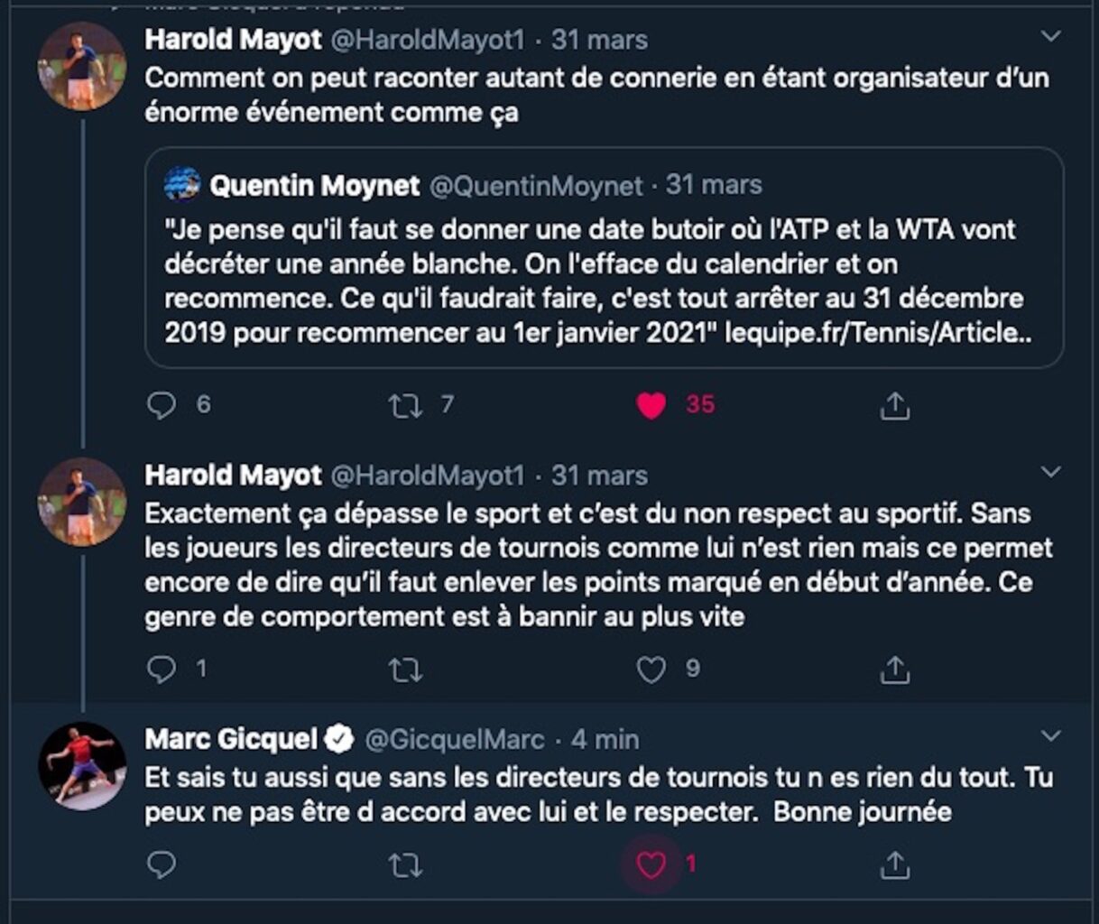 Twitter est un réseau social qui peut être très virulent. A la suite de la publication de l’interview de Gérard Tsobanian, directeur du tournoi de Madrid, dans L’Equipe ce mercredi, le jeune espoir tricolore Harold Mayot (lauréat de l’Open d’Australie chez les juniors en janvier) avait réagi vivement en expliquant que ces propos étaient indignes.