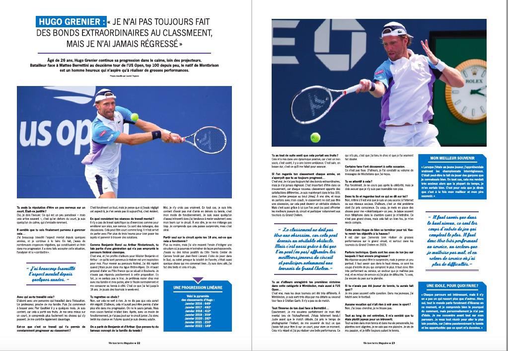 Dans notre numéro 82 nous avons donné la parole à Hugo Grenier lors d’un entretien riche et qui résume bien le parcours de ce joueur qui n’a cessé de progresser pour atteindre dernièrement le Top 100.