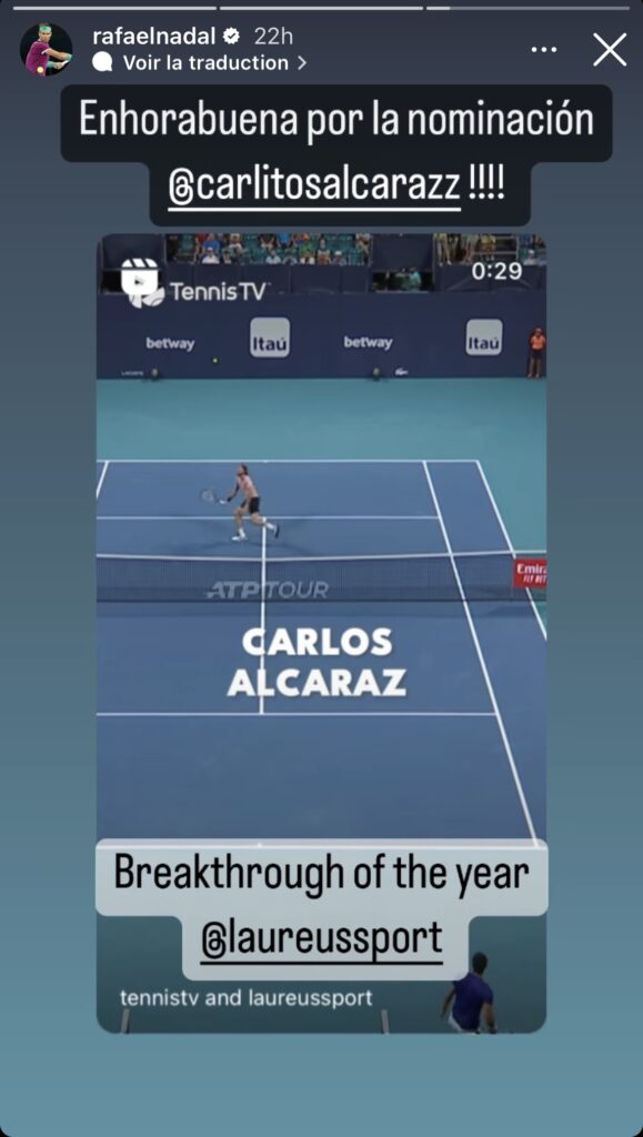 Et une fois de plus, il a pensé à son jeune compatriote Carlos Alcaraz, qu’il a félicité pour sa nomination dans la catégorie « meilleure progression de l’année ».