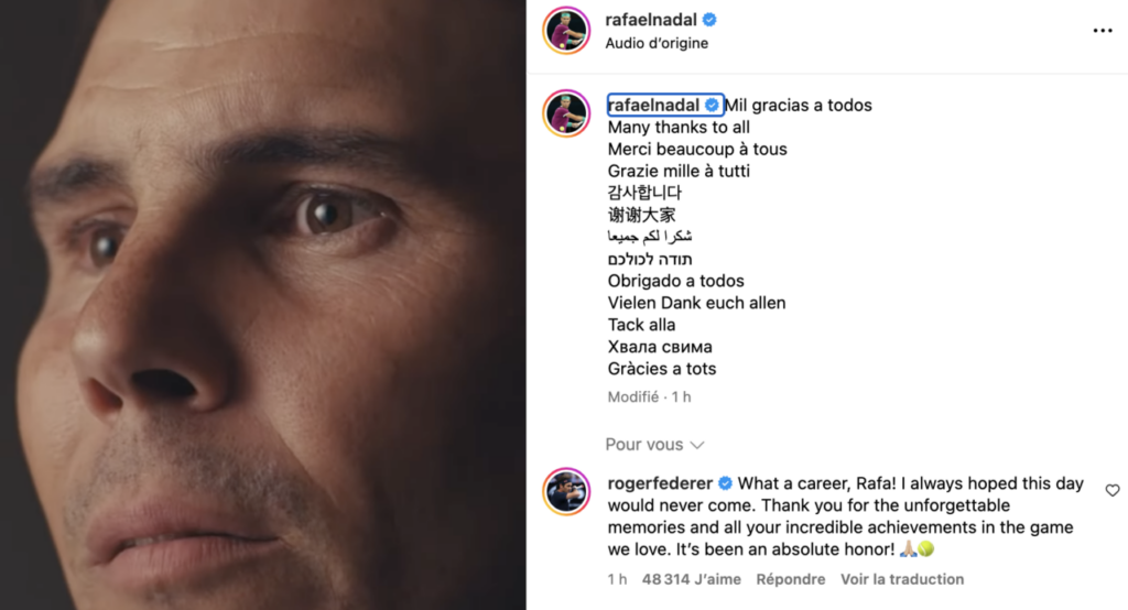 « Quelle carrière Rafa ! J’ai toujours espéré que ce jour n’arriverait jamais. Merci pour les souvenirs inoubliables et toutes tes réalisations incroyables dans le jeu que nous aimons. Ce fut un honneur absolu », a écrit le Maestro suisse qui n’a pas mis longtemps à réagir à la déclaration pleine d’émotion du champion espagnol.
