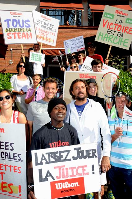 Le buzz de la matinée ! A l’occasion d’une opération de com’ de la marque Wilson, une fausse manifestation avait été organisée du Tennis Club de Paris à la Place d’Auteuil… L’objectif : réhabiliter les raquettes Juice et Steam, soit‐disant illégales du fait de leurs propriétés trop performantes. Evidemment, c’est de la communication, mais assez amusante, il faut le reconnaître. Une cinquantaine de personnes – selon les services de police, évidemment… – s’étaient données rendez‐vous, avec la bénédiction d’un Henri Leconte tout feu, tout flamme. Certains manifestent bien pour le droit des fourmis, alors pour des raquettes, why not !