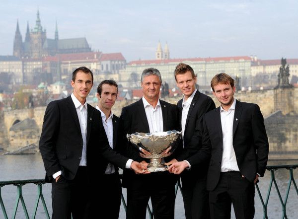 Après la fête d’hier soir, les vainqueurs de la Coupe Davis 2012 ont posé ce matin en costume avec le saladier d’argent en plein coeur de Prague. La photo :