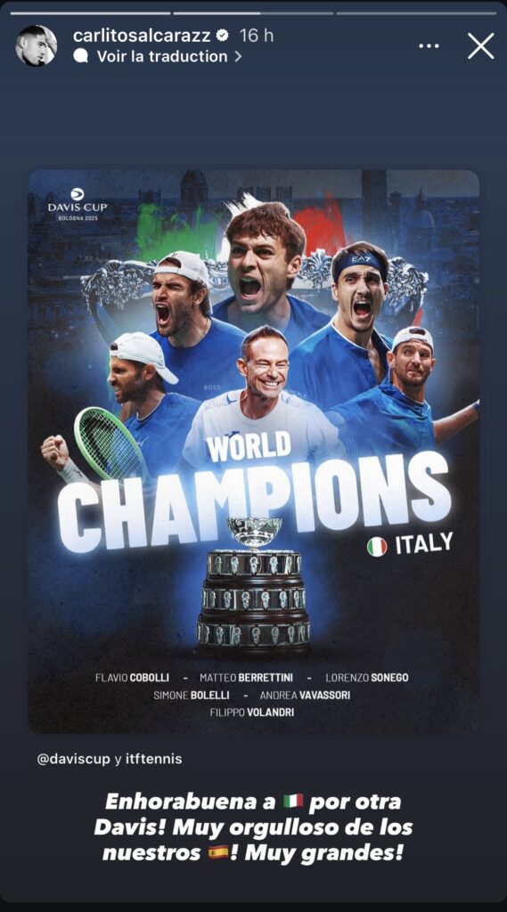 « Félicitations à l’Italie pour cette nouvelle Coupe Davis ! Je suis très fier des nôtres. Vous avez été très grands. Nous sommes tombés ensemble. Et nous nous relèverons ensemble. Nous continuerons à rêver. Nous reviendron », a écrit Carlos Alcaraz dans sa story Instagram.
