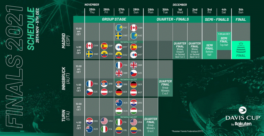 Plus que deux jours avant le début des phases finales de la Coupe Davis édition 2021. Alors que les demi‐finales et la finale se dérouleront à Madrid à partir du 3 décembre, les premiers tours auront lieu dans trois villes différentes dont Madrid, à Turin, en Italie, et à Innsbruck, en Autriche.