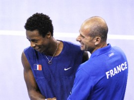 Kohlschreiber en prend un coup, forcément. A 2–2, la Monf’ se procure trois balles de break. Et sur une grosse faute en revers, l’Allemand perd son service. Derrière, Monfils sert le plomb pour se sortir d’un jeu compliqué, et confirme son break. Il inquiète même Kohlschreiber sur son jeu de service, mais ne réussit pas le double break. Qu’importe : un ace, deux services gagnants et une faute adverse plus tard, Gaël se retrouve à un jeu du match. Courageux, l’Allemand l’oblige à servir pour le match. C’est loin de faire peur à Monfils. Un grand coup droit décroisé, un ace, et le voilà à deux points du match. Derrière, Gaël joue l’intox sur un coup où il perd même sa raquette. Et ça marche ! Trois balles de match. Un ace suffira. Et le numéro sept mondial finit par s’imposer (7−6, 7–6, 6–4). La France mène 2–0, et peut passer en demi‐finales dès demain, si Jo‐Wilfried Tsonga et Michael Llodra devaient s’imposer en double.