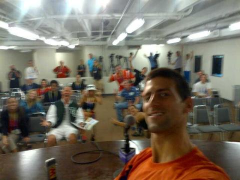 On se marre avec Novak Djokovic en confé­rence de presse ! Le Serbe a posté cete photo sur Facebook, à l’oc­ca­sion de son premier exer­cice média­tique du tournoi. L’ambiance était… décontractée !