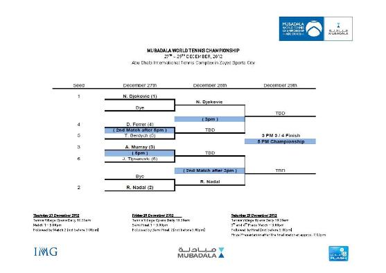 Pas grand chose à se mettre sous la dent en cette fin de saison ? Voilà qui calmera les plus impatients. Les organisateurs du tournoi exhibition d’Abu Dhabi ont dévoilé aujourd’hui, sur la page Facebook de l’épreuve, le tableau des rencontres. Et le moins que l’on puisse dire c’est que les amateurs de tennis seront gâtés en cette période de fête – 27 au 29 décembre. De beaux matchs en perspective avec la présence de six joueurs du Top 10. Et, surprise du chef, le retour de Rafa ! Ce dernier pourrait d’ailleurs affronter pour son retour l’Écossais Andy Murray.