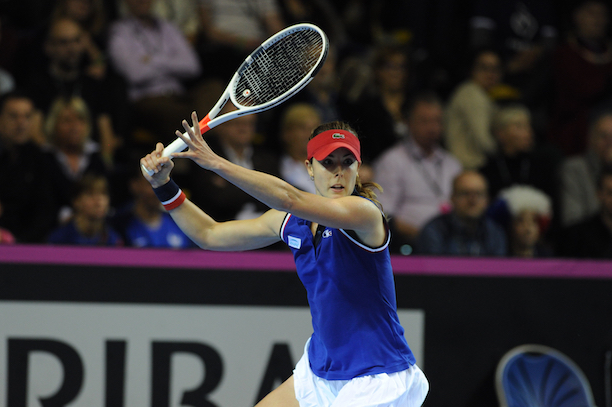 La rencontre entre la Suisse et la France a débuté par un premier simple aux multiples rebondissements ! Timea Bacsinszky a apporté la victoire à son équipe en dominant Alizé Cornet 7–5 6–4 après 2h13 de jeu. Le premier set a été terrible puisqu’il duré 1h18 ! La Suisse mène 1–0. Le deuxième simple mettra aux prises les deux copines, Belinda Bencic et Kristina Mladenovic.