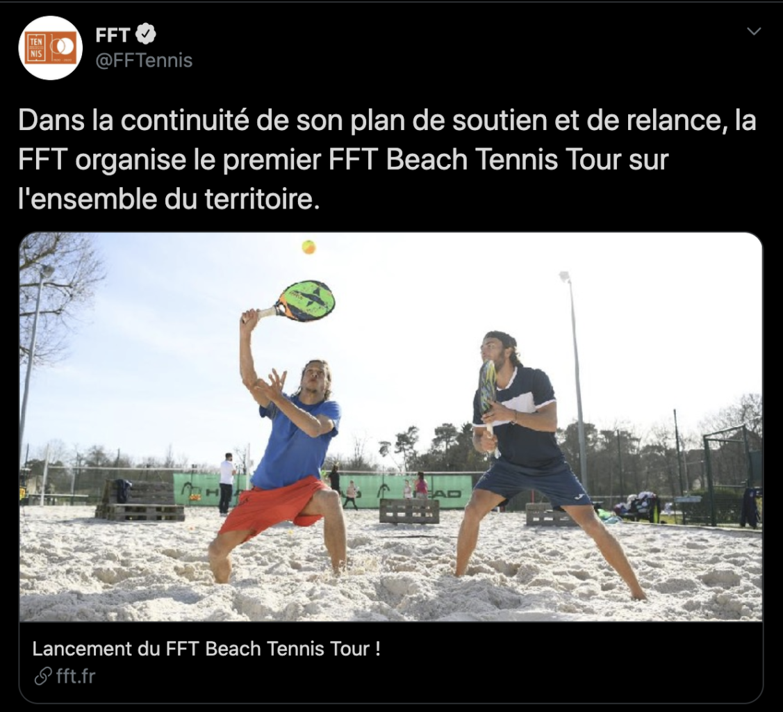 A la suite du plan de soutien et de relance, la Fédération française de tennis a décidé d’organiser son premier « FFT Beach Tennis Tour ». Le circuit se déroulera entre août et octobre et il permettra la reprise du beach tennis grâce à des dizaines de tournois, du FFT BT 25 au FFT BT 1000. La carte des tournois est disponible ci‐dessous.