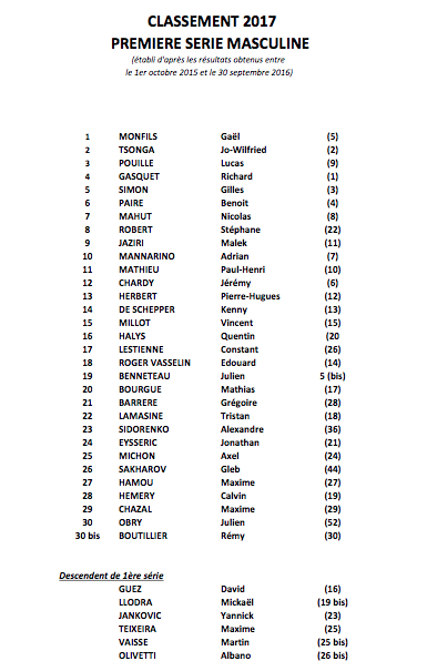 La Fédération française de tennis vient de publier le classement de la première série 2017. Gaël Monfils et Caroline Garcia sont les nouveaux numéros 1 français. Voici l’ensemble des deux classements de la première série française.