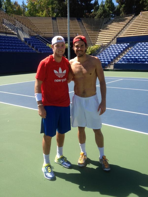 On vous voit venir, mesdames, mesdemoiselles… Mais vous n’en aurez pas plus ! Il ne s’agit que d’une photo du Tommy Haas pendant un entraînement avec le jeune Jack Sock à Los Angeles ! Même avec ses plus belles années derrière soi il n’y a pas de place pour le relâchement !