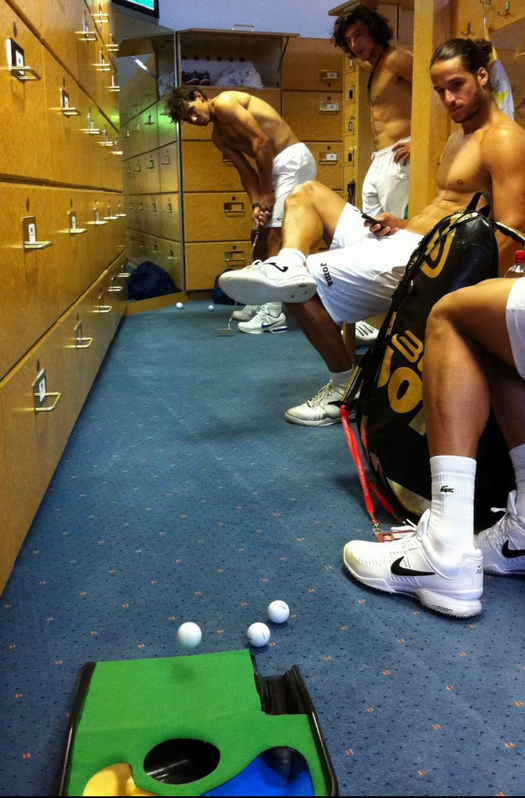 On peut voir les trois hommes, torses nues dans les vestiaires de Wimbledon, en train de jouer sur un « green » de golf improvisé.