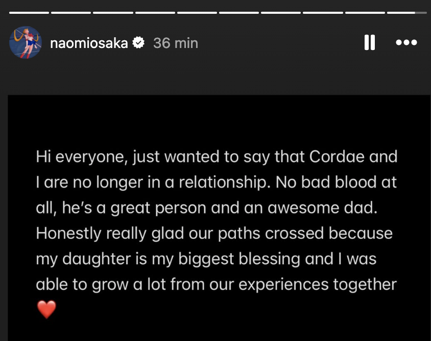 C’est dans un message court et modéré posté sur son compte Instagram que Naomi Osaka a tenu à annoncer publiquement sa séparation avec le père de sa fille, Cordae, qui est aussi un célèbre rappeur et chanteur américain.