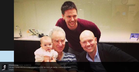 Alors que ses petits camarades du circuit bataillent aux Etats‐Unis, Robin, lui, n’est toujours pas de retour sur le court. On croirait presque que ça ne lui manque pas, vu comme il semble accaparé par sa petite Olivia. Presque. La présence de John McEnroe sur ce cliché raconte certainement l’inverse !