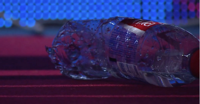 Battu lors de la première manche de la demi‐finale face à Denis Shapovalov (4−6), Andrey Rublev a pété une durite lors d’un changement de côté et a littéralement explosé une bouteille d’eau en plastique sauf qu’il y en avait de partout.