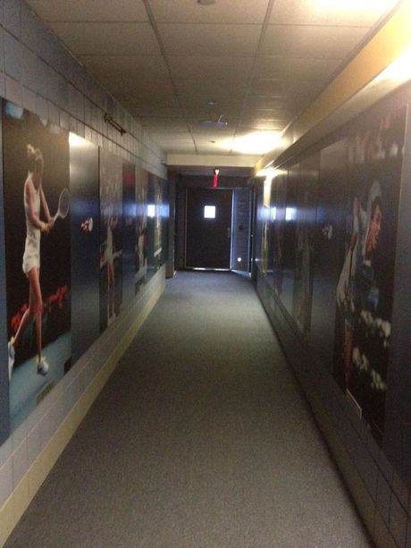 …Voici ce que vous verriez juste avant d’entrer sur le court ! Cette photo a effectivement été prise dans le couloir qui mène au plus grand stade de tennis au monde. Un endroit quelque peu sinistre, malgré les portraits de champions placardés sur les murs. Un endroit où on l’imagine, beaucoup de joueurs ont soudainement ressenti une sacrée montée d’adrénaline…