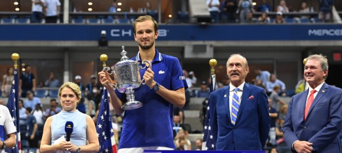 On le voit bien sur les images ci‐dessous, Daniil Medvedev regarde le trophée et ne trouve pas son nom. Du coup, il commence légèrement à s’inquiéter. Stan Smith, en habitué et avec ses célèbres chaussures au pied vient à la rescousse et tout rentre dans l’ordre. Le Russe oublie sa grimace pour un large sourire.