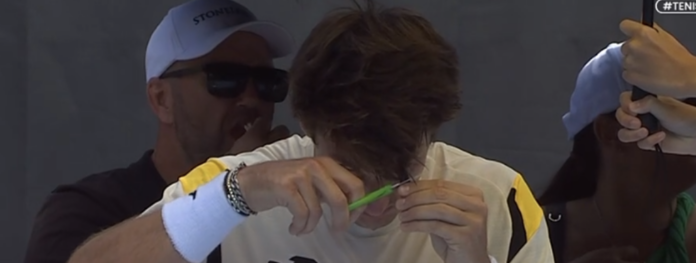 Lors d’un changement de côté, l’Argentin Ugo Carabelli (47e mondial) a sorti un ciseau pour se couper une mèche de cheveux.