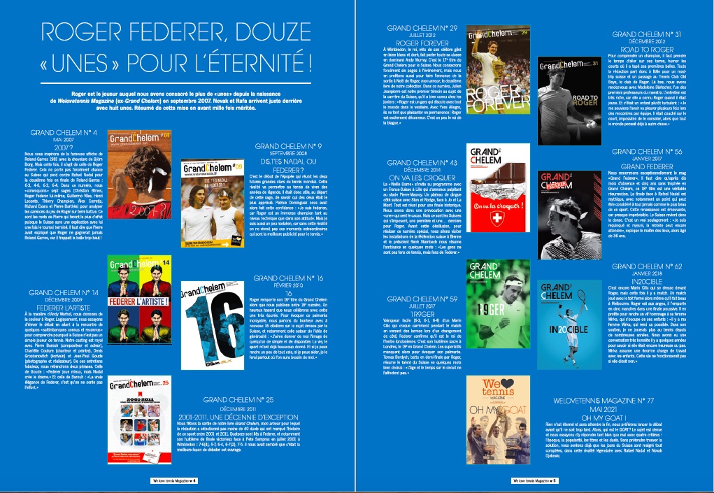 Dans le numéro 82 de We Love Tennis Magazine disponible ci‐dessous, nous avons consacré une double page aux différentes unes du magazine consacrées à Roger Federer.