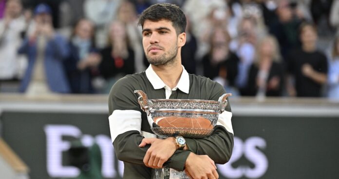 En finale de Roland‐Garros, Carlos Alcaraz a pris le meilleur sur Jannik Sinner, au terme d’une rencontre homérique de 5 h 30 de jeu (6−4, 7–6, 4–6, 6–7, 6–7).