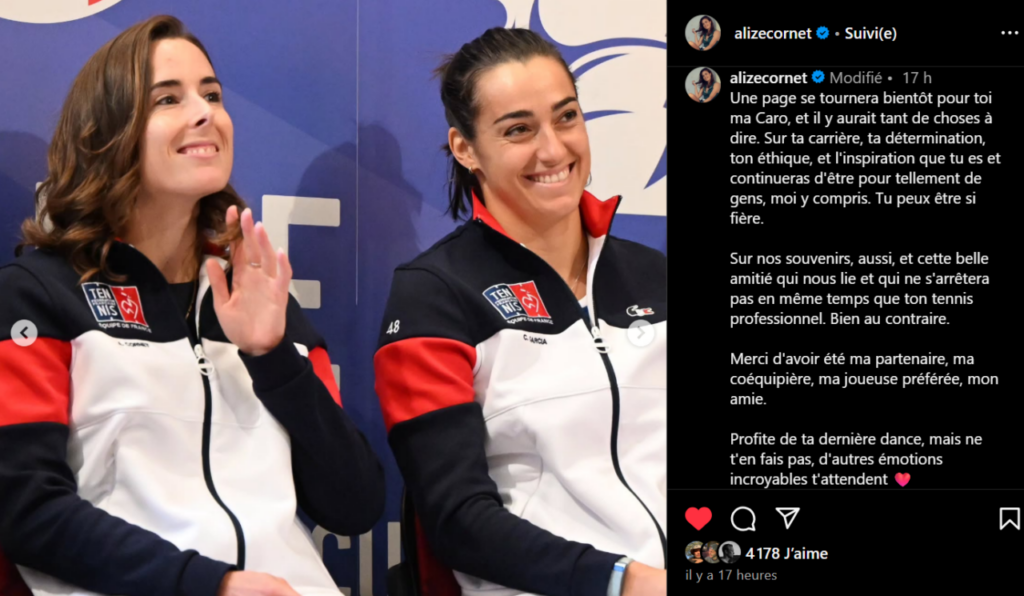 Sur sa page Instagram, on y retrouve un carrousel de photos souvenirs des deux joueuses en équipe de France, accompagné d’éloges concernant sa carrière mais également des conseils pour gérer au mieux l’après‐tennis. Parmi eux, le fait de profiter un maximum de chaque instant passé sur la terre battue parisienne.