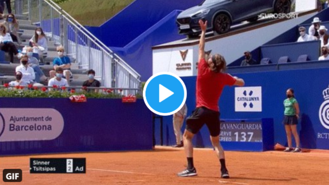 Dans une forme éblouissante, Stefanos Tsitsipas a l’occasion d’enchaîner contre le talentueux et dangereux Jannik Sinner. Apparemment un peu trop déterminé, il en lâche sa raquette au service, à 2–2 dans le premier set. Mais pleinement dans son match, le Grec n’en démord pas et continue son point, revenant sur ses appuis avec sa raquette fantôme avant de se rendre compte qu’elle est au sol, deux mètres devant lui !