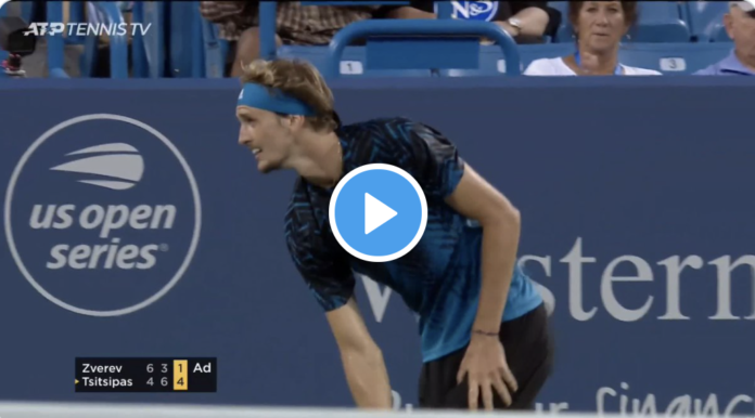 Dans le set décisif, le Grec double breake, mène 4–1 et semble se diriger vers un 7e succès en 9 matchs contre Alexander Zverev.