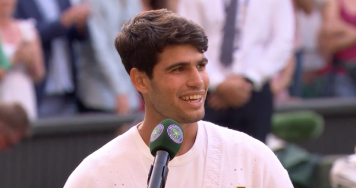 Battu en quatre sets par Jannik Sinner en finale de Wimbledon, Carlos Alcaraz, qui ne réalisera pas un triplé sur le gazon londonien, a comme d’habitude faire preuve de beaucoup de classe lors de son discours pendant la cérémonie de remise des prix.