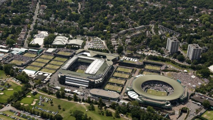 Aerial view of grounds of The All England Lawn Tennis & Croquet Club, Wimbledon, taken during The Championships in 2011 from the east. Day 7 - Monday 27/06/2011. Credit: AELTC / Thomas Lovelock.