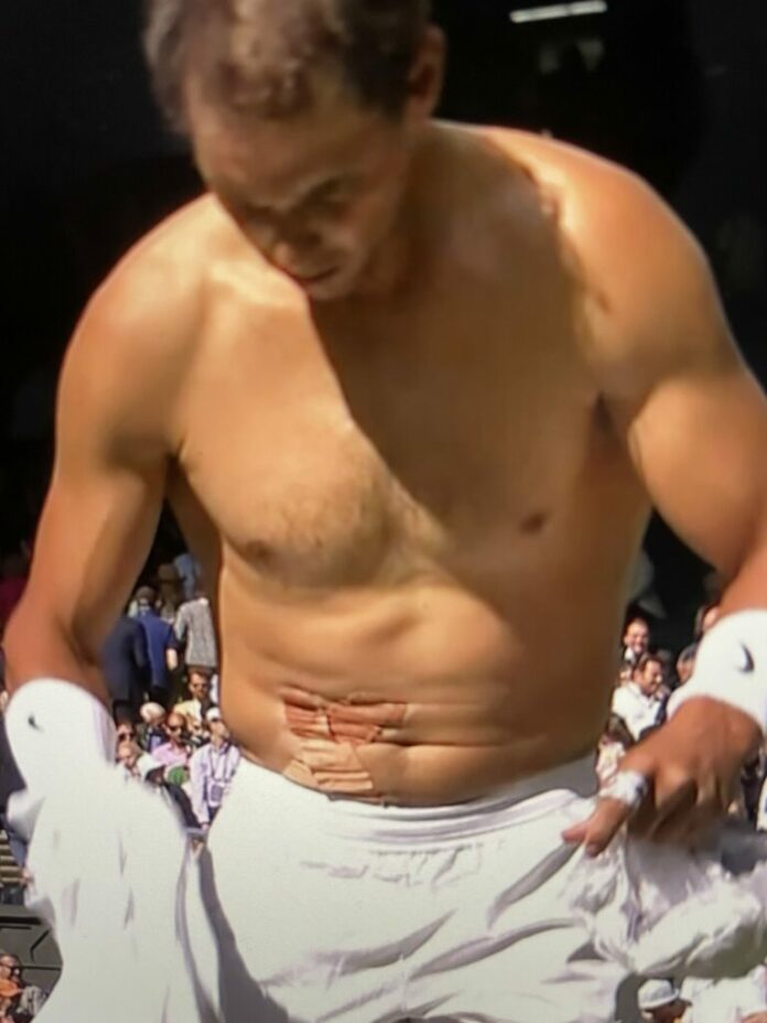 Alors qu’il ne semble plus trop souffrir de son pied gauche, une nouvelle blessure pourrait l’embêter pour la suite de Wimbledon. Le Majorquin joue son 2e tour contre Ricardas Berankis ce jeudi après‐midi avec un strap aux abdominaux. L’image a été capturée par l’un de ses fans, forcément soucieux.