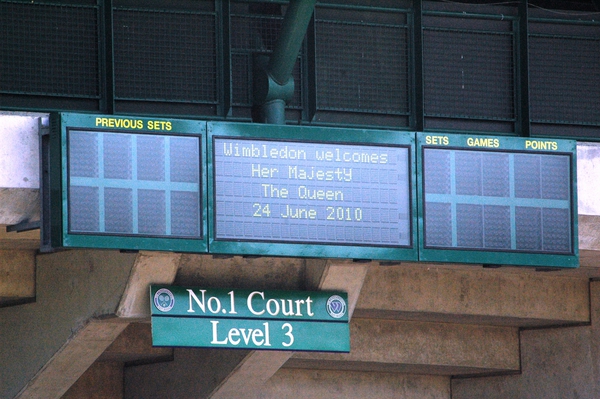 C’est un évènement aujourd’hui à Wimbledon. Sa Majesté la reine d’Angleterre viendra assister à quelques matches sur le Centre Court dont celui d’Andy Murray. Bien installée dans sa « Royal Box », la reine devrait être chouchoutée tout au long de son après‐midi. En tout cas, le staff du stade est sur le qui‐vive depuis quelques jours. Tout doit être propre et parfait pour accueillir sa grandeur. En témoigne ce petit message de bienvenue…
