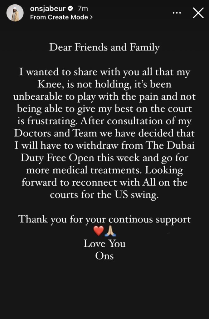 « Chers amis et famille. Je voulais partager avec vous tous que mon genou ne tient pas, c’est insupportable de jouer avec la douleur et de ne pas être capable de donner le meilleur de moi‐même sur le court, c’est frustrant. Après consultation de mes médecins et de mon équipe, nous avons décidé que je devais me retirer du Dubai Duty Free Open cette semaine et suivre d’autres traitements médicaux. J’ai hâte de reprendre contact avec tout le monde sur les courts pour la tournée américaine. Merci pour votre soutien continu. Je vous aime », a écrit Jabeur sur son compte Twitter.