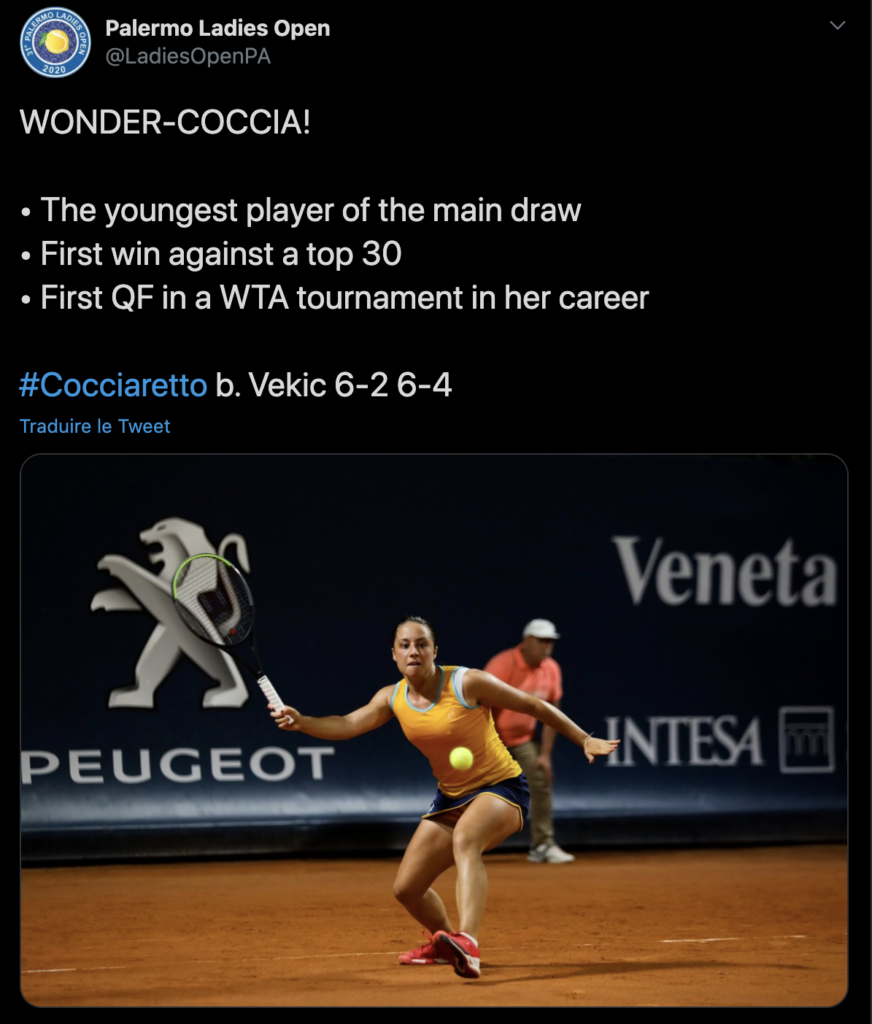 Elisabetta Cocciaretto est la surprise du chef à Palerme. Bénéficiaire d’une wild‐card, la Transalpine réussit un sublime parcours en signant deux succès en deux sets sur Polona Hercog et surtout sur Donna Vekic, 24e mondiale, sa première victoire sur une membre du Top 30. A 19 ans et 6 mois, l’Italienne (157e) devient la plus jeune joueuse de son pays à atteindre les quarts de finale d’un tournoi WTA depuis Karin Knapp (19 ans et 1 mois à Palerme en 2006) et Sara Errani (19 ans et 3 mois à Budapest en 2006). Face à Anett Kontaveit et Laura Siegemund, elle tentera de poursuivre l’aventure et de rejoindre le dernier carré.