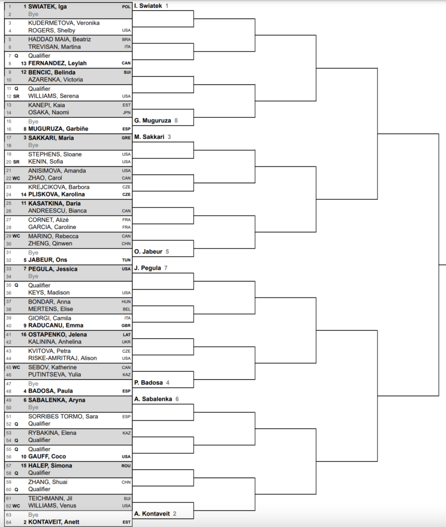 À noter que Serena Williams affrontera une qualifiée et que sa soeur, Venus, fera face à la Suissesse Teichmann (21e). La tête de série numéro une du tournoi est, sans surprise, Iga Swiatek, alors que Kontaveit est numéro deux.